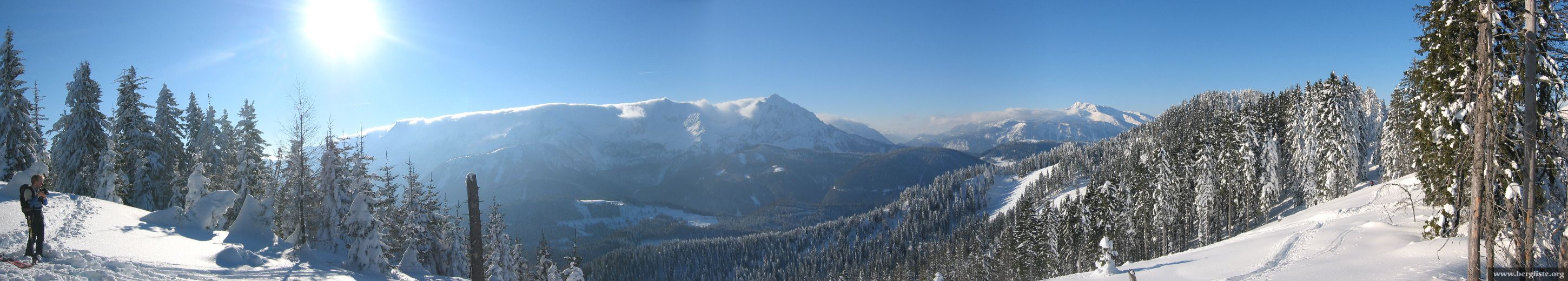| Panorama: Blick nach Süden auf die Berge der Haller Mauern, die sich langsam von ihrer Wolkenhaube befreien. | ||