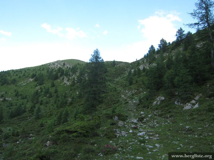 | Schnell habe ich die ersten hundert Höhenmeter hinter mir gelassen und erreiche die Einmündung des Wegs, über den mein Vater direkt vom Staff (2217m) abgestiegen ist. | ||
